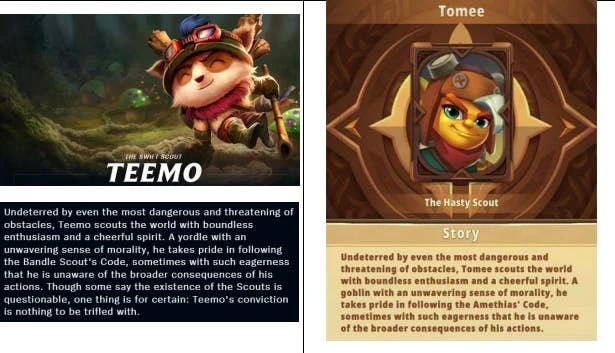 不仅如此,Imba复制了角啬的名字,甚至包含了与之相关的背景故事。例如,LoL中的英雄提莫(Teemo)在《I Am Hero》中以“Tomee”出现,其故事几乎逐字复制(见下图)。