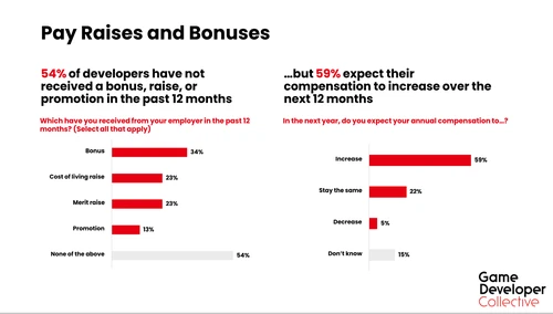 根据游戏开发者联盟(Game Developer Collective)最新的调查显示,2023年开发者的薪资基本持平。调研中,54%的受访者表示去年没有获得任何加薪或奖金。