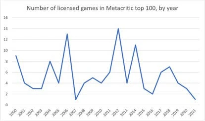 通过观察这些数据,我可以非正式地告诉你,现在在评分极端的两端,无论是顶层还是底层的游戏中,原创游戏的比例比以往任何时候都要高得多。虽然我没有详细审查中间大量的游戏——这些游戏可能被授权游戏所过度代表,评分多为7/10的“粉丝会喜欢”评论——但我整体的感觉是,以前声誉不佳、正在复兴的授权游戏类别,现在变得不那么显眼了。