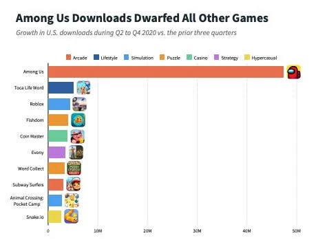 尤其是在2020年第二季度至第四季度的表现中,Among Us表现尤为抢眼。如下图所示,图表清楚展示了其在这段时间的突出表现: