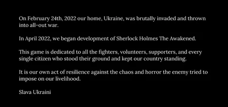 2022年4月,Frogwares 开始了《福尔摩斯:觉醒》的开发工作。这款游戏献给所有战士、志愿者、支持者,以及每一个为国家努力坚守的乌克兰人民。它也是我们抗争混乱与恐怖的象征,彰显了乌克兰人民的坚韧不拔。