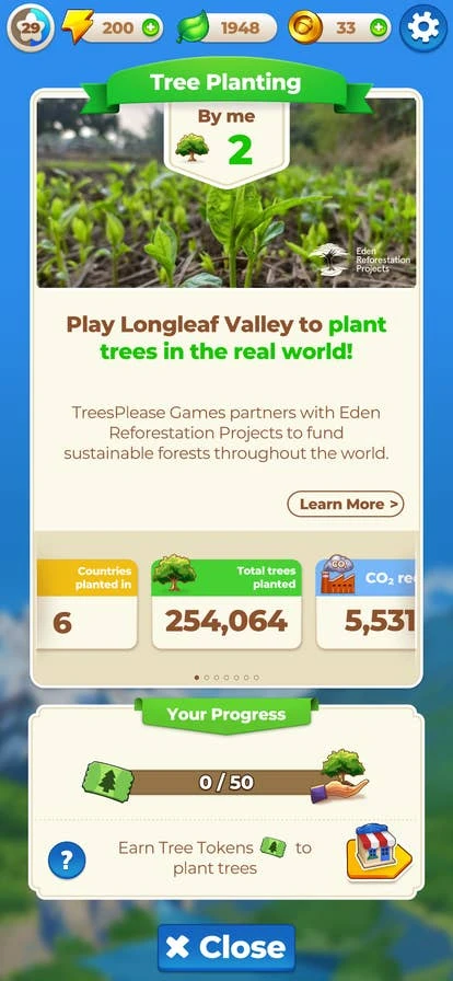 《Longleaf Valley》是一款免费休闲合成游戏,讲述一位科学家制造学清恢复被人类破坏的景观中植物的故事。玩家在游戏中完成任务,将获得“树币”——一种非的游戏内货币。在积攒足够的树币后,玩家可以向“伊甸恢复项目”捐款,帮助现实中种下一棵树。