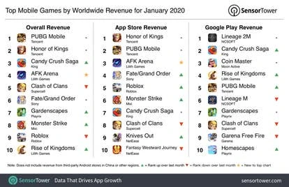 中国对全球游戏收入的影响在2020年1月的收入榜单中表现得淋漓尽致,腾讯的《和平精英》(Honor of Kings)和《绝地求生:刺激战场》(PUBG Mobile)位居榜首。